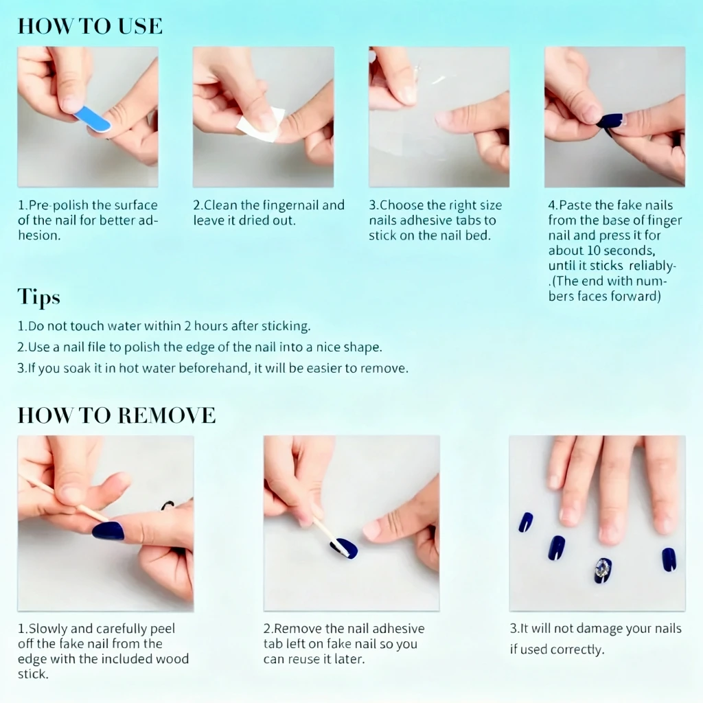 2.Graceful Design: These fake nails make your nails eye-catching, very realistic looking and comfortable to wear, suitable for nail salons and DIY manicures at home.
