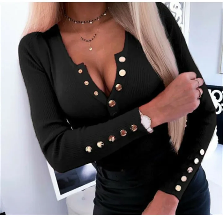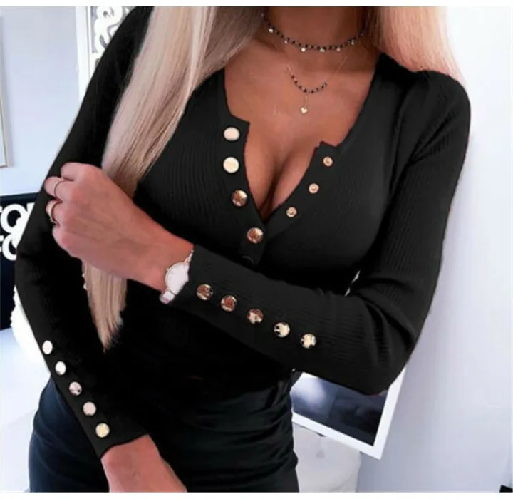 Slim V-Neck Long Sleeve Button-Up Top